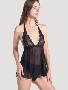 This sexy sheer lace babydoll features bow tie closure on the back. With triangle lace cup that seamlessly joins with a sheer mesh underbust, creating an alluring, yet graceful look. Completing the set is the matching high-waist panty, which features crossing elastic on the back. The high-waist style ensures comfort while maintaining a sleek and stylish silhouette.
