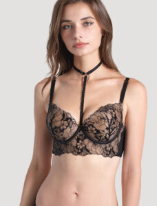 This Embroidered Push-Up Bra is adorned with delicate embroidery lace that extends from the upper cups to under the chest, beautifully edged with scalloped lace. Featuring a removable halter string adorned with tasteful metal accessories, offering the perfect blend of functionality and fashion. Whether you choose to wear it as a statement piece or for an added touch of glamour under your outfit.
