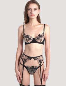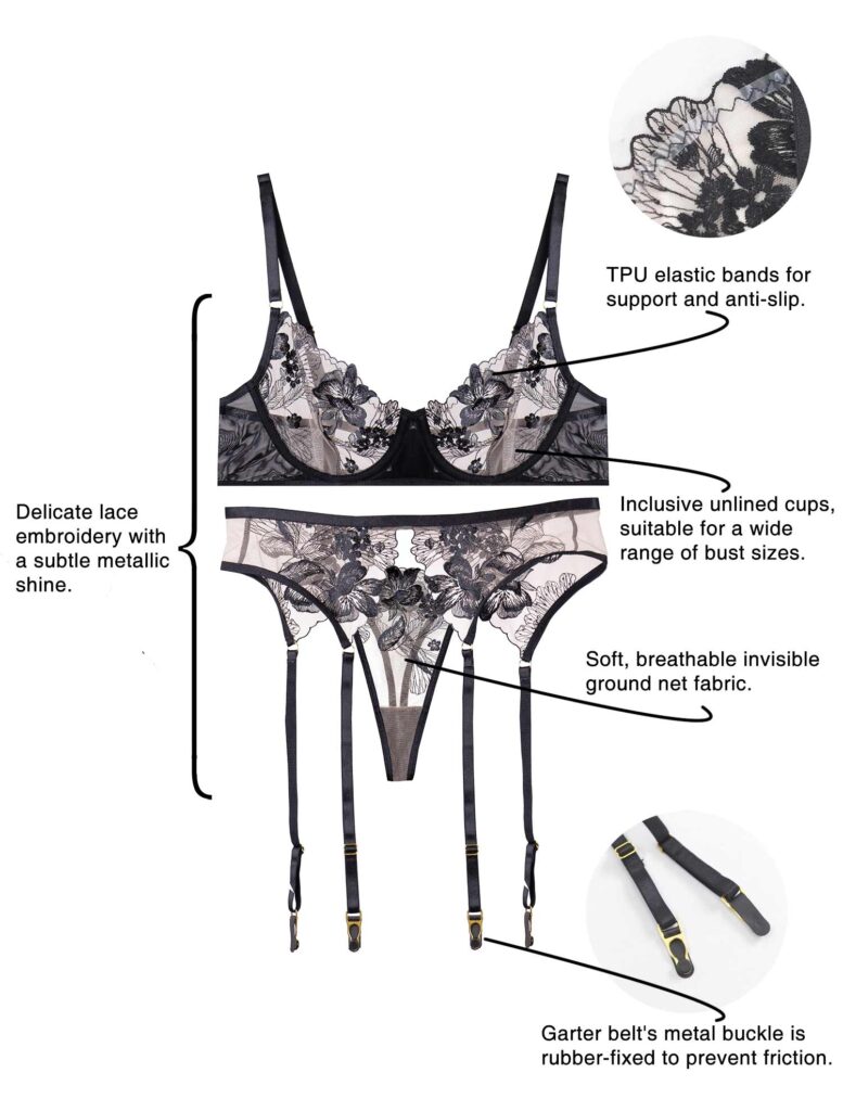 Designed for inclusivity, the Floral Embroidered Lingerie Set Black features mesh accents that provide a supportive yet delicate touch under the bust and along the side wings. This lingerie set takes the timeless beauty of black floral embroidery and sets it against invisible mesh, crafting an air of mystery and allure. This unique combination ensures a fit that is as comfortable as flattering, catering to diverse body shapes.