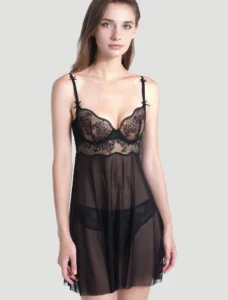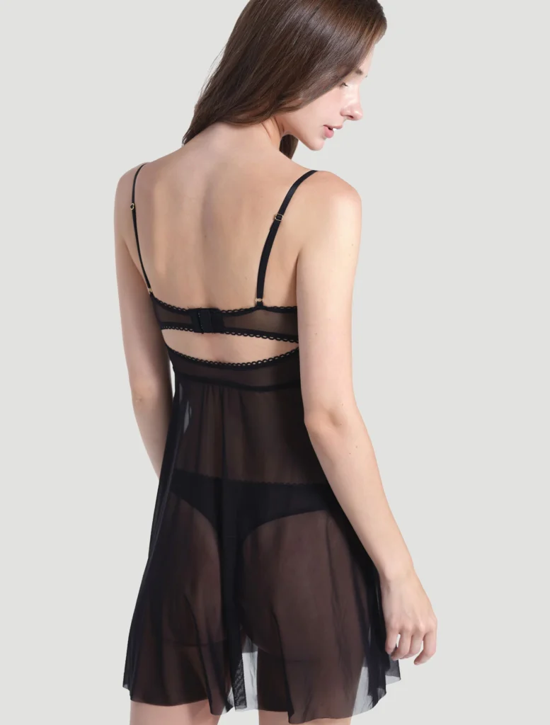 Crafted with exquisite detail, this Black Floral Sheer Babydoll combines delicate embroidered lace cups and supportive underwire for comfort and allure. Charming ribbon bows on the shoulder straps add a whimsical touch, while the recycle yarn net mesh hemline and unique waist hollow-out design offer a sophisticated and seductive appeal. A perfect fusion of elegance, comfort, and sustainability.