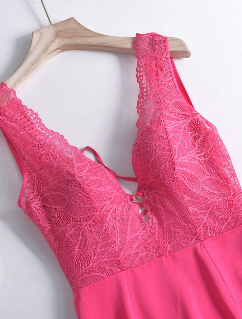 Experience unmatched elegance with the Lace Top Satin Split Midi Dress in Pink. Crafted from acetate fabric, this dress ensures a smooth, silky feel in a stunning pink shade. The deep V-neckline, adorned with lace and a central metal ornament, creates a look of refined beauty. Its underwire and cotton cup provide comfortable support, while the overlapped hemline adds a sensual appeal. Ideal for various occasions, this dress is a must-have for the fashion-forward individual.