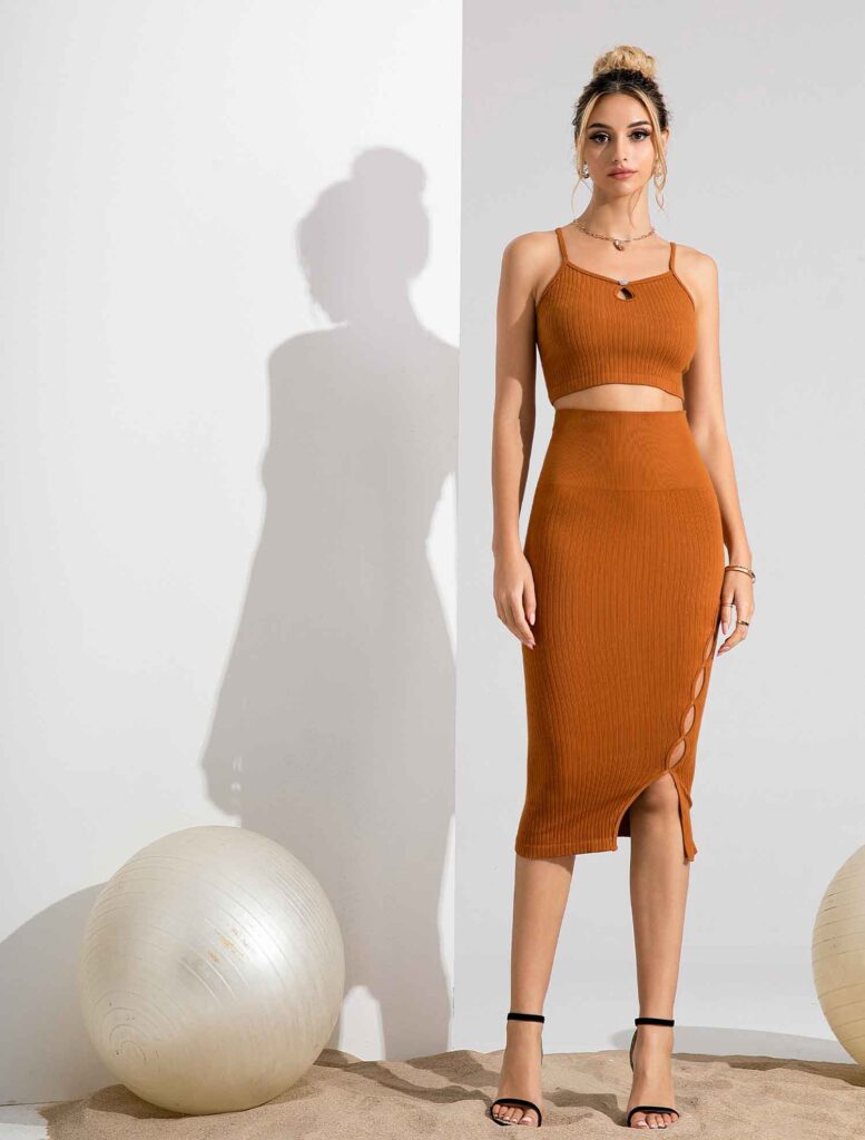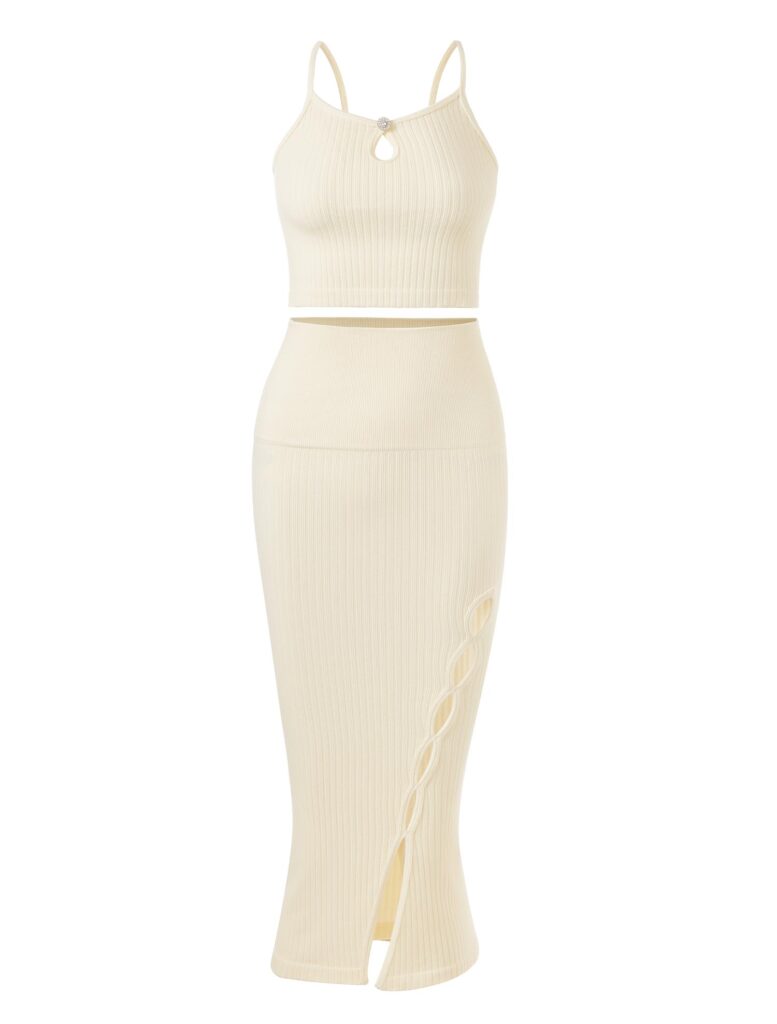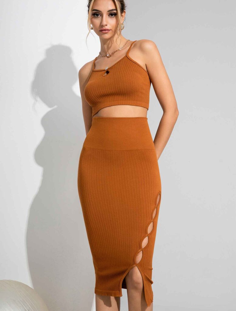 Our New Seamless Two-Piece Maxi Dress combines a form-fitting knit vest with a graceful maxi skirt, detailed with a stylish slit. The top’s teardrop cut-out and button details add a sparkle of elegance, while the skirt offers sleek comfort and with its asymmetrical slit. This dress also features tummy control functionality, enhancing its sleek silhouette.