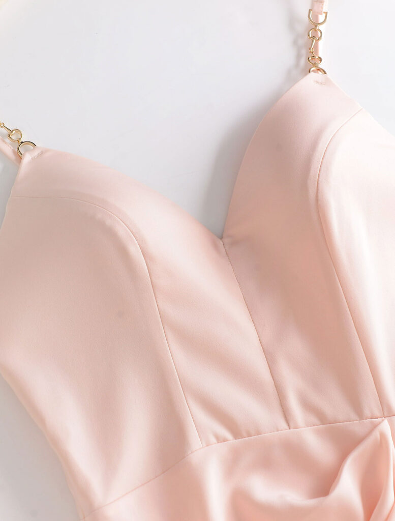 This Triangle Cup Satin Midi Dress in Champagne is made from premium woven satin, it showcases a natural shine and a silky smooth texture. It features a built-in Pad and metal-ornamented shoulder straps for a touch of sophistication. Ruched hemline and high side slit enhance your figure, making this classic midi dress a versatile choice for any occasion.